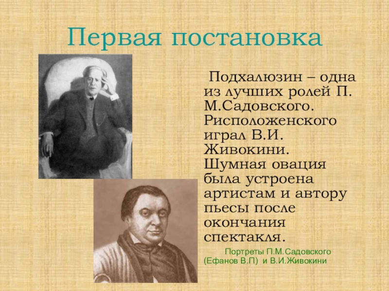 одна из лучших ролей П.М.Садовского. Рисположенского играл В.И.Живокини. Шумная овация была устроена артистам и автору пьесы после окончания спектакля.