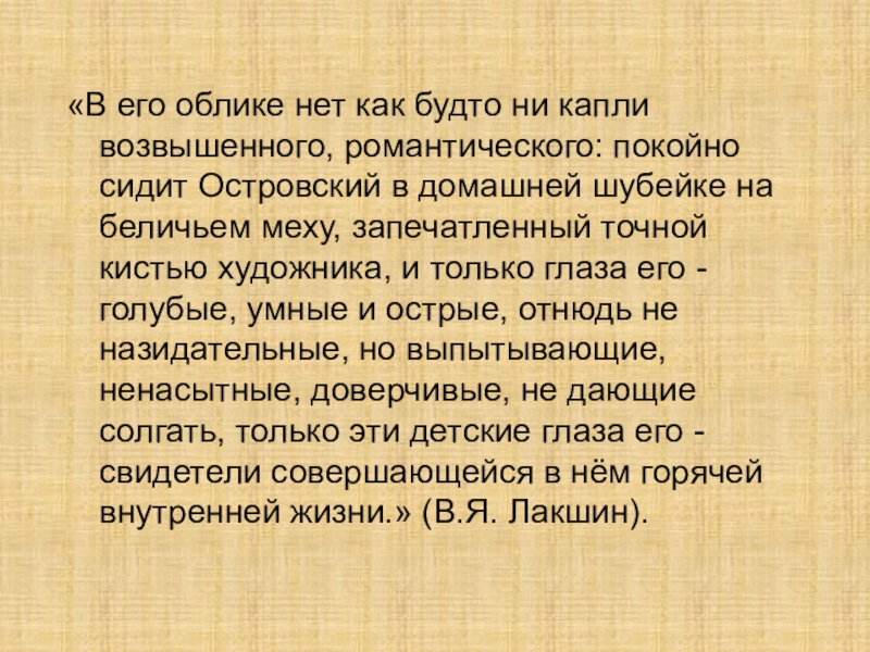 сидит Островский в домашней шубейке на беличьем меху, запечатленный точной кистью художника, и только глаза его - голубые, умные и острые, отнюдь не назидательные, но выпытывающие, ненасытные, доверчивые, не дающие солгать, только эти детские глаза его - свидетели совершающейся в нём горячей внутренней жизни.» (В.Я. Лакшин).
