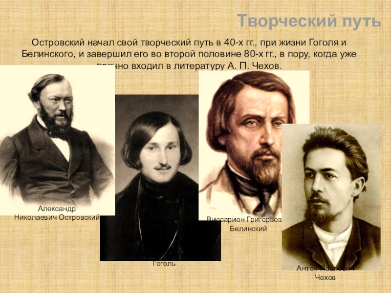 Слайд 11Островский начал свой творческий путь в 40-х гг., при жизни Гоголя и