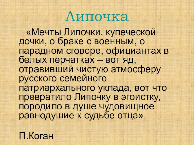 военным, о парадном сговоре, официантах в белых перчатках – вот яд, отравивший чистую атмосферу русского семейного патриархального уклада, вот что превратило Липочку в эгоистку, породило в душе чудовищное равнодушие к судьбе отца».