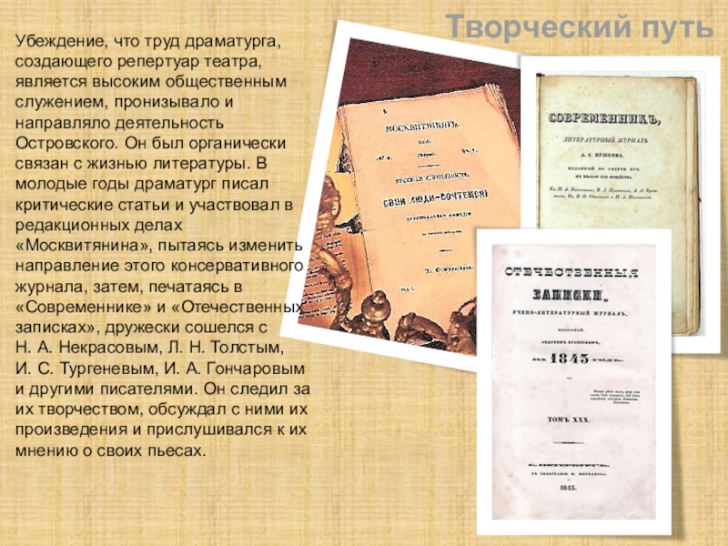 служением, пронизывало и направляло деятельность Островского. Он был органически связан с жизнью литературы. В молодые годы драматург писал критические статьи и участвовал в редакционных делах «Москвитянина», пытаясь изменить направление этого консервативного журнала, затем, печатаясь в «Современнике» и «Отечественных записках», дружески сошелся с Н. А. Некрасовым, Л. Н. Толстым, И. С. Тургеневым, И. А. Гончаровым и другими писателями. Он следил за их творчеством, обсуждал с ними их произведения и прислушивался к их мнению о своих пьесах.