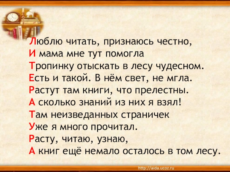 Люблю читать, признаюсь честно,  И мама мне тут помогла Тропинку отыскать в лесу чудесном.