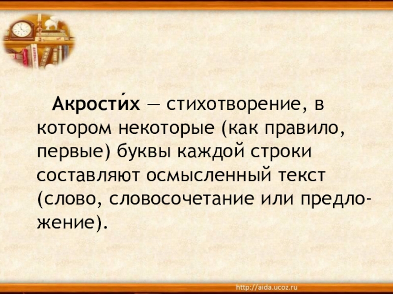 Слайд 2 Акрости́х — стихотворение, в котором некоторые (как правило, первые)