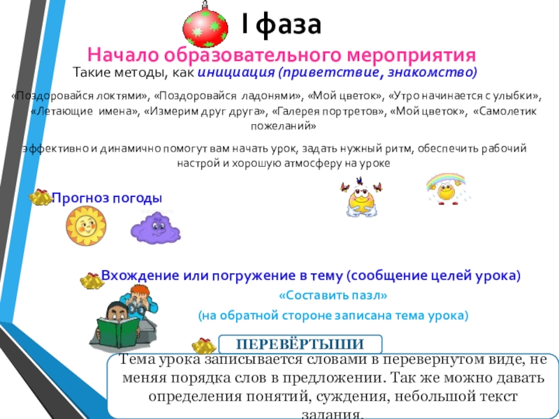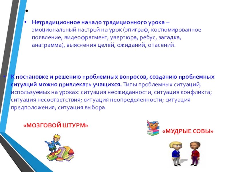 Нетрадиционное начало традиционного урока – эмоциональный настрой на урок (эпиграф, костюмированное появление, видеофрагмент, увертюра, ребус, загадка, анаграмма), выяснения целей, ожиданий, опасений.