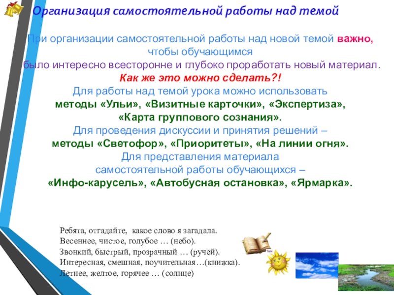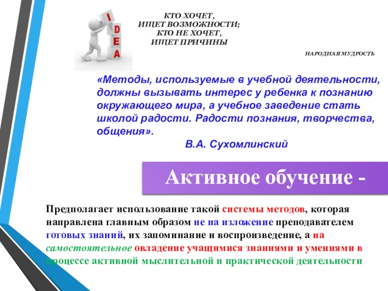 Активные методы обучения помогают активизировать процесс, учебно-информационных и учебно-организационных умений.