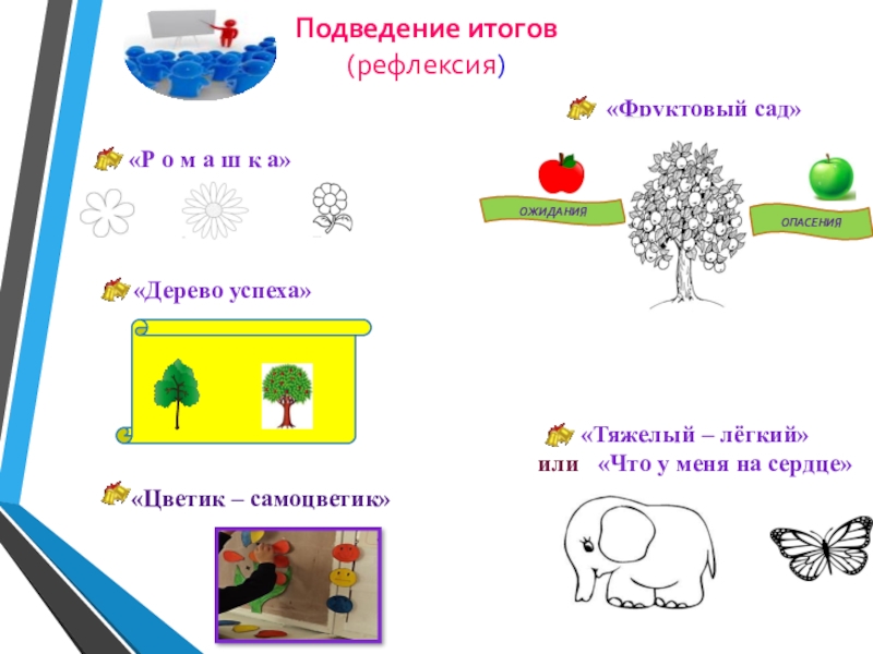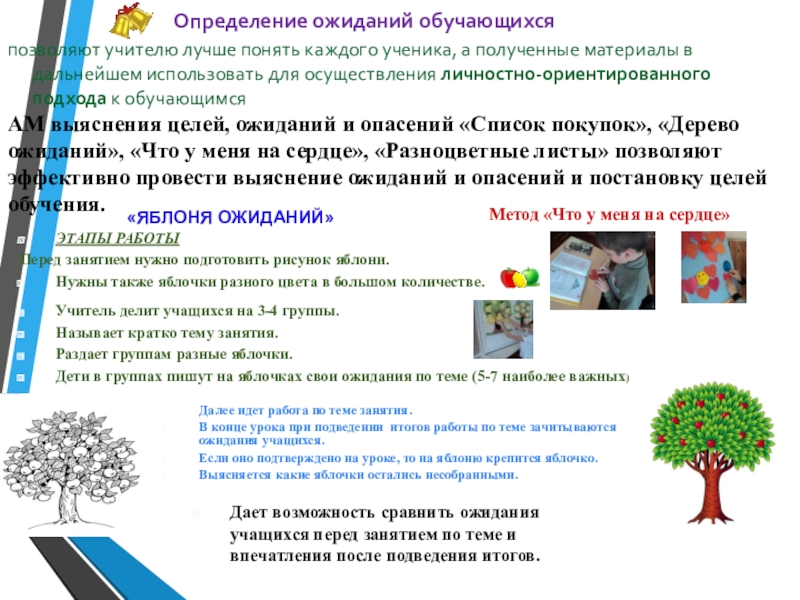 АМ выяснения целей, ожиданий и опасений «Список покупок», «Дерево ожиданий», «Что у меня на сердце», «Разноцветные листы» позволяют эффективно провести выяснение ожиданий и опасений и постановку целей обучения.