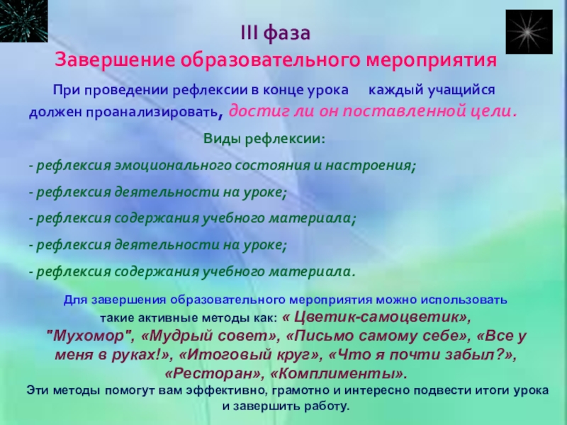 При проведении рефлексии в конце урока каждый учащийся должен проанализировать, достиг ли он поставленной цели.