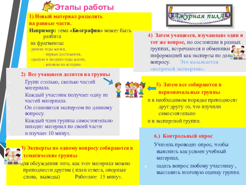 4) Затем учащиеся, изучающие один и тот же вопрос, но состоящие в разных группах, встречаются и обмениваются информацией как эксперты по данному вопросу. Это называется «встречей экспертов».
