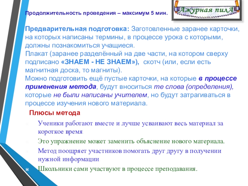 Обучающимся данный метод позволит более четко определиться со своими образовательными целями, озвучить свои ожидания и опасения, с тем, чтобы учитель мог их знать и учитывать в образовательном процессе.
