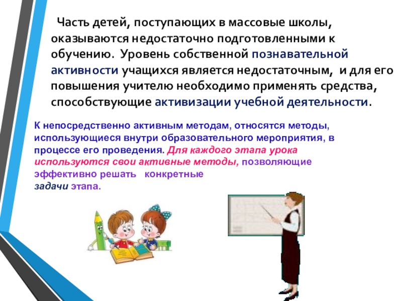 Часть детей, поступающих в массовые школы, оказываются недостаточно подготовленными к обучению. Уровень собственной познавательной активности учащихся является недостаточным, и для его повышения учителю необходимо применять средства, способствующие активизации учебной деятельности.