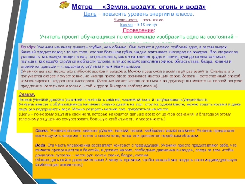 Огонь. Ученики активно двигают руками, ногами, телом, изображая языки пламени. Учитель предлагает всем ощутить энергию и тепло в своем теле, когда они двигаются подобным образом.