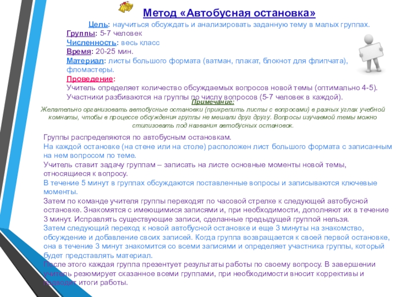 Желательно организовать автобусные остановки (прикрепить листы с вопросами) в разных углах учебной комнаты, чтобы в процессе обсуждения группы не мешали друг другу. Вопросы изучаемой темы можно стилизовать под названия автобусных остановок.