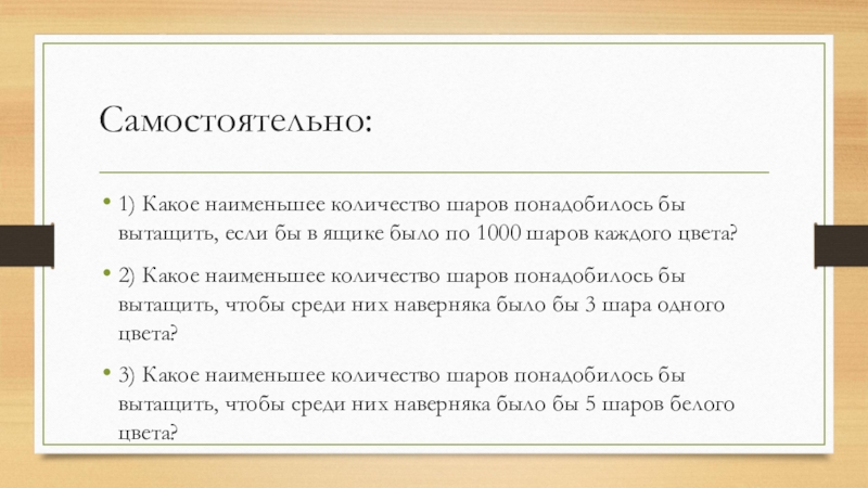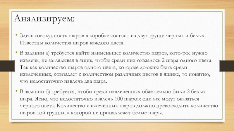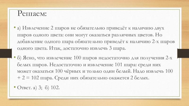 В задании а) требуется найти наименьшее количество шаров, кото-рое нужно извлечь, не заглядывая в ящик, чтобы среди них оказалось 2 шара одного цвета. Так как количество шаров одного цвета, которые должны быть среди извлечённых, совпадает с количеством различных цветов в ящике, то понятно, что недостаточно извлечь два шара.