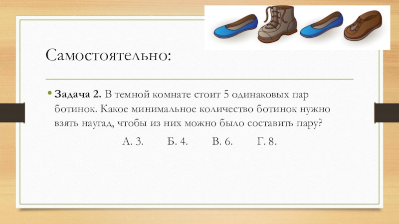 Задача 2. В темной комнате стоит 5 одинаковых пар ботинок. Какое