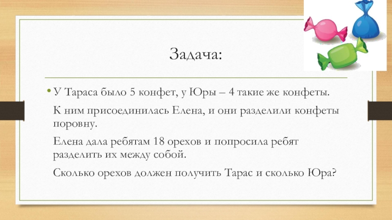 У Тараса было 5 конфет, у Юры – 4 такие же