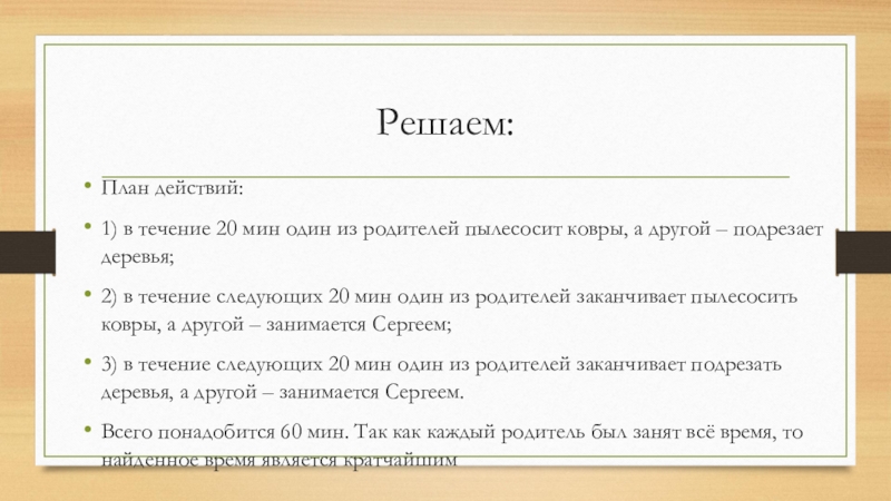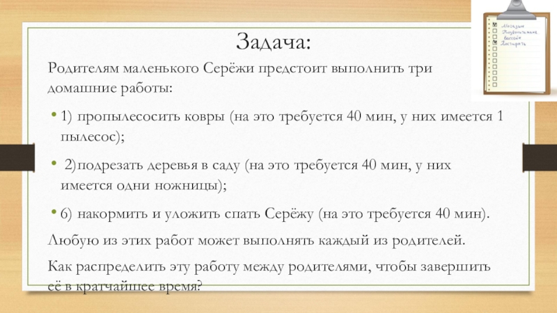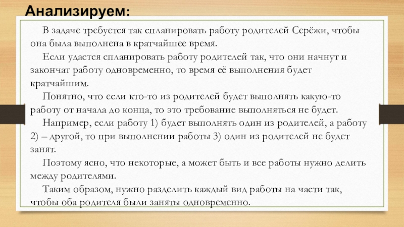 В задаче требуется так спланировать работу родителей Серёжи, чтобы она
