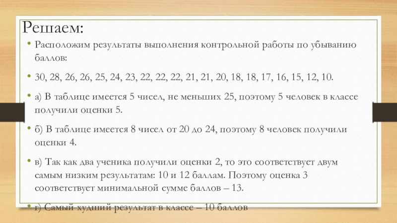 Расположим результаты выполнения контрольной работы по убыванию баллов:
