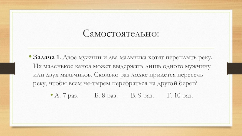 Задача 1. Двое мужчин и два мальчика хотят переплыть реку. Их
