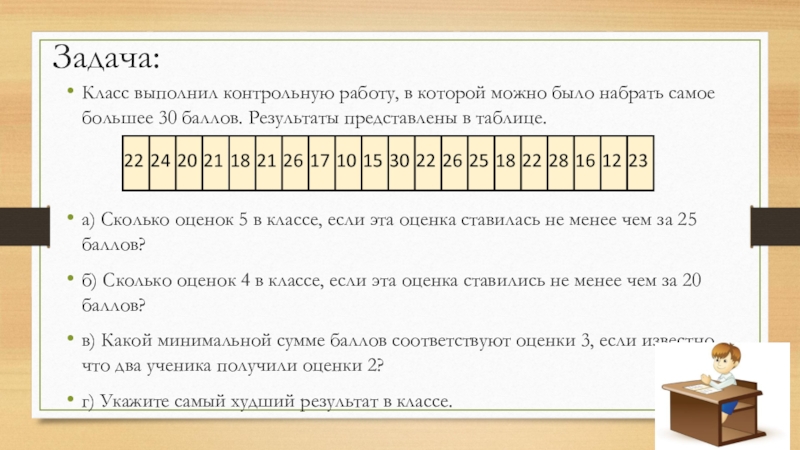 В таблице приведены результаты (в баллах) выполнения контроль-ной работы в классе.
