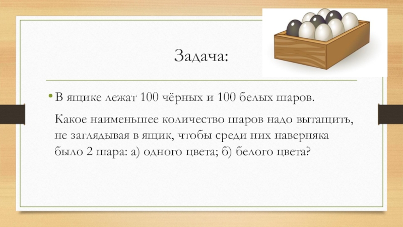 количество шаров надо вытащить, не заглядывая в ящик, чтобы среди них наверняка было 2 шара: а) одного цвета; б) белого цвета?