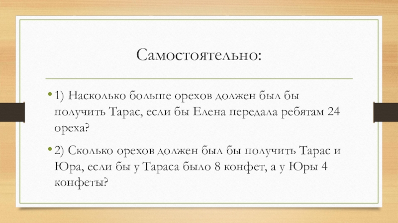 1) Насколько больше орехов должен был бы получить Тарас, если бы
