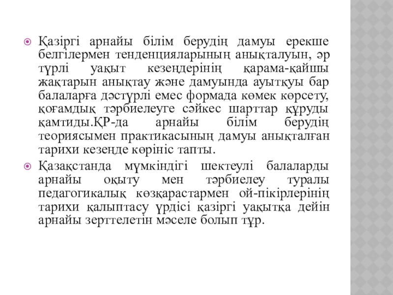 Слайд 8Қазіргі арнайы білім берудің дамуы ерекше белгілермен тенденцияларының анықталуын, әр түрлі