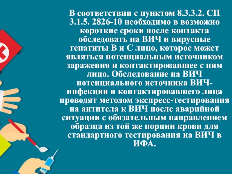 короткие сроки после контакта обследовать на ВИЧ и вирусные гепатиты В и С лицо, которое может являться потенциальным источником заражения и контактировавшее с ним лицо. Обследование на ВИЧ потенциального источника ВИЧ-инфекции и контактировавшего лица проводят методом экспресс-тестирования на антитела к ВИЧ после аварийной ситуации с обязательным направлением образца из той же порции крови для стандартного тестирования на ВИЧ в ИФА.