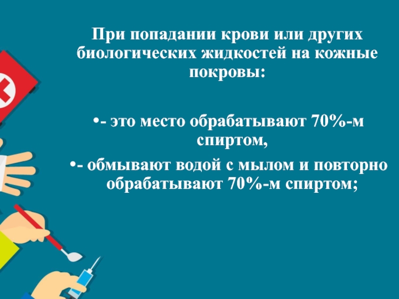 При попадании крови или других биологических жидкостей на кожные покровы: