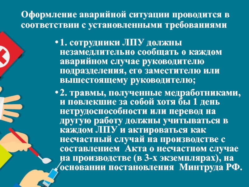 2. травмы, полученные медработниками, и повлекшие за собой хотя бы 1 день нетрудоспособности или перевод на другую работу должны учитываться в каждом ЛПУ и актироваться как несчастный случай на производстве с составлением Акта о несчастном случае на производстве (в 3-х экземплярах), на основании постановления Минтруда РФ.