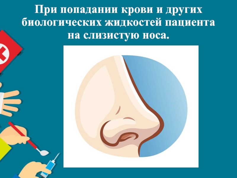 При попадании крови и других биологических жидкостей пациента на слизистую носа.