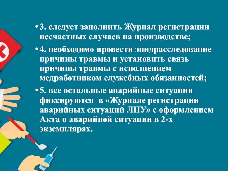 3. следует заполнить Журнал регистрации несчастных случаев на производстве;