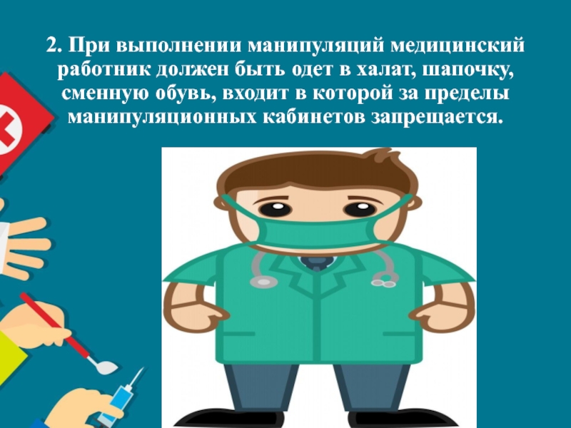 2. При выполнении манипуляций медицинский работник должен быть одет в халат, шапочку,