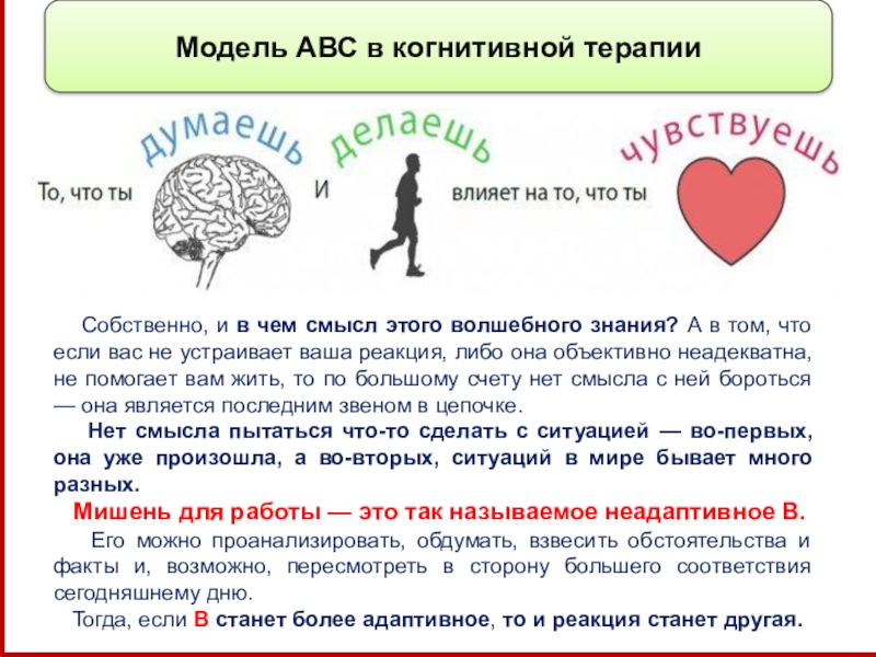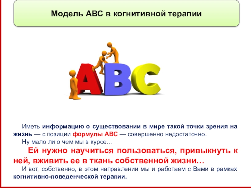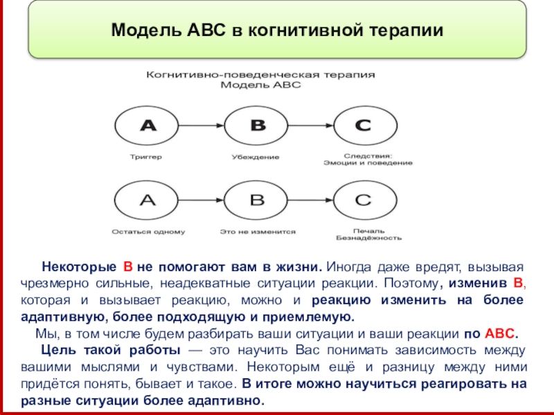 Главное положение когнитивной терапии раскрывается через понимание АВС модели восприятия жизни. Можно понять причины стресса через АВС модель когнитивной терапии. Когнитивная терапия стресса — какие мысли и как приводят нас к стрессу и усиливают стресс.