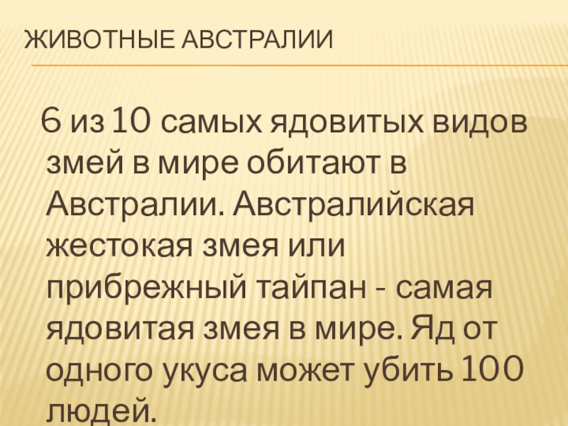 обитают в Австралии. Австралийская жестокая змея или прибрежный тайпан - самая ядовитая змея в мире. Яд от одного укуса может убить 100 людей.