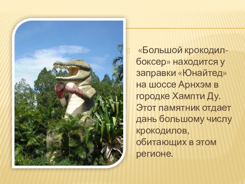 Слайд 30 «Большой крокодил-боксер» находится у заправки «Юнайтед» на шоссе Арнхэм в