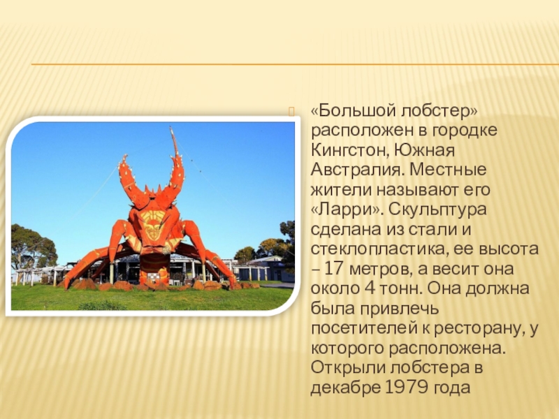Слайд 28«Большой лобстер» расположен в городке Кингстон, Южная Австралия. Местные жители называют