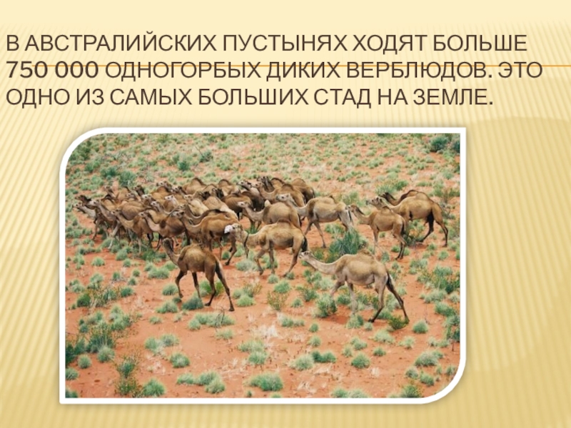 Слайд 8В австралийских пустынях ходят больше 750 000 одногорбых диких верблюдов. Это