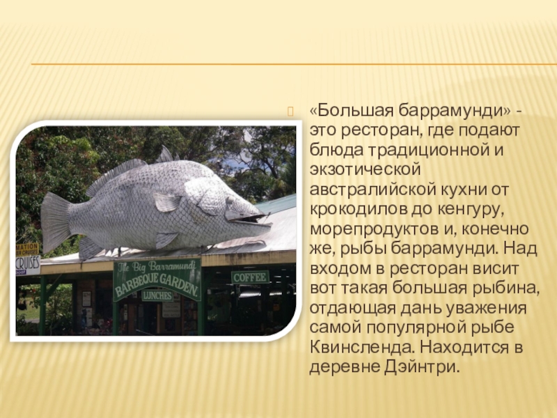 австралийской кухни от крокодилов до кенгуру, морепродуктов и, конечно же, рыбы баррамунди. Над входом в ресторан висит вот такая большая рыбина, отдающая дань уважения самой популярной рыбе Квинсленда. Находится в деревне Дэйнтри.