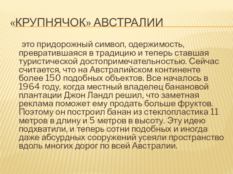 ставшая туристической достопримечательностью. Сейчас считается, что на Австралийском континенте более 150 подобных объектов. Все началось в 1964 году, когда местный владелец банановой плантации Джон Ландл решил, что заметная реклама поможет ему продать больше фруктов. Поэтому он построил банан из стеклопластика 11 метров в длину и 5 метров в высоту. Эту идею подхватили, и теперь сотни подобных и иногда даже абсурдных сооружений усеяли пространство вдоль многих дорог по всей Австралии.