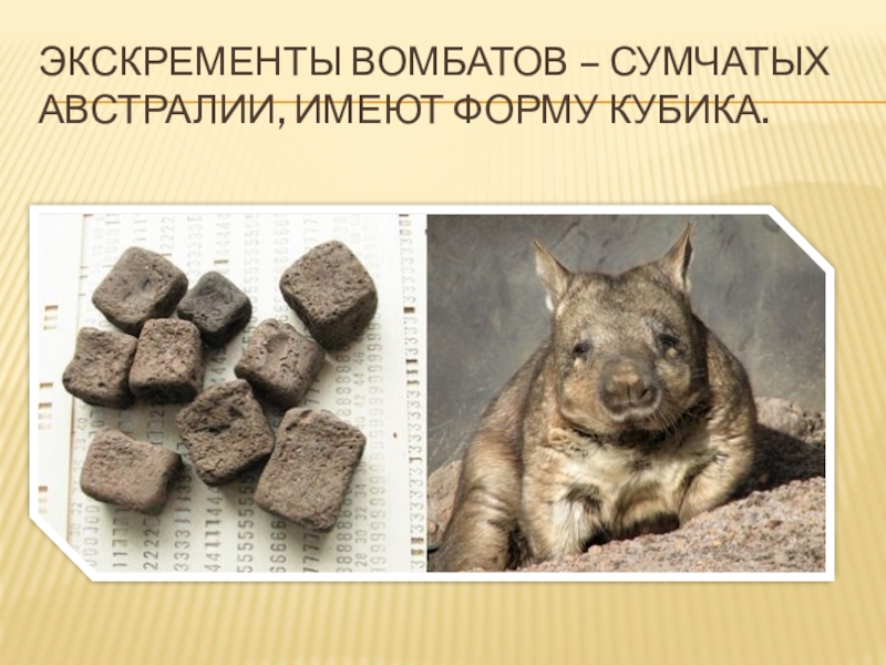 Слайд 12Экскременты вомбатов – сумчатых Австралии, имеют форму кубика.