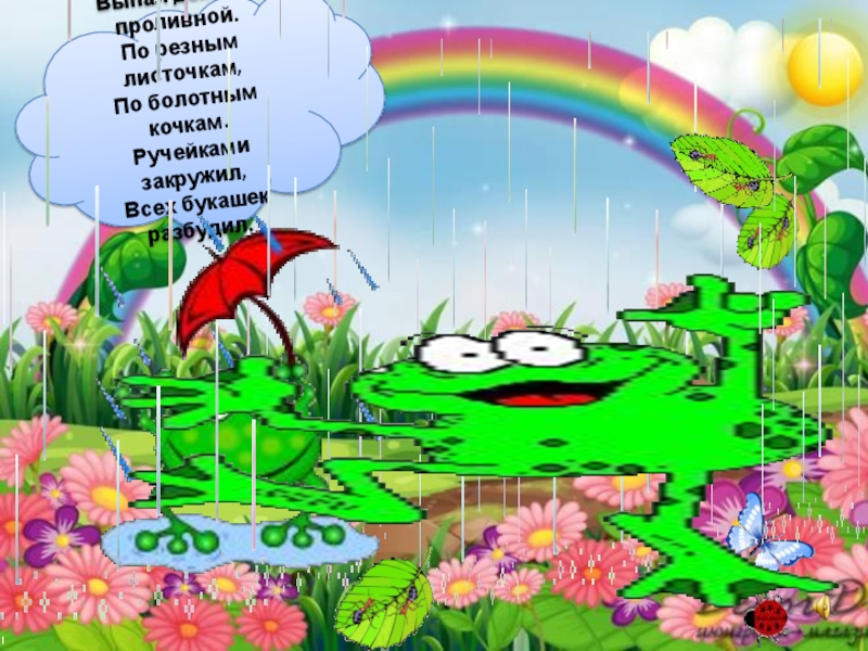 Слайд 36Выпал дождик проливной. По резным листочкам, По болотным кочкам. Ручейками закружил, Всех букашек разбудил.