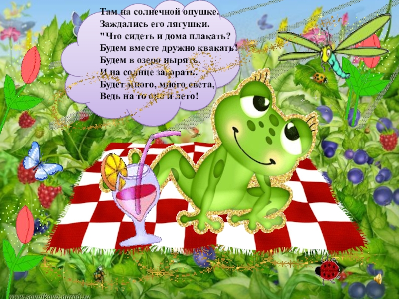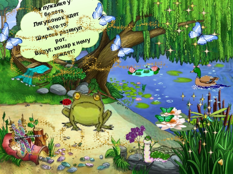 Слайд 23На лужайке у болота Лягушонок ждет кого-то, Широко разинул рот, Вдруг, комар к нему