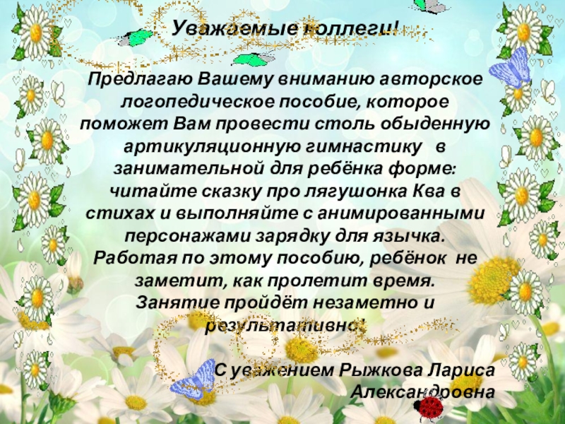 Уважаемые коллеги!Предлагаю Вашему вниманию авторское логопедическое пособие, которое поможет Вам провести столь обыденную артикуляционную гимнастику в занимательной для ребёнка форме: читайте сказку про лягушонка Ква в стихах и выполняйте с анимированными персонажами зарядку для язычка.