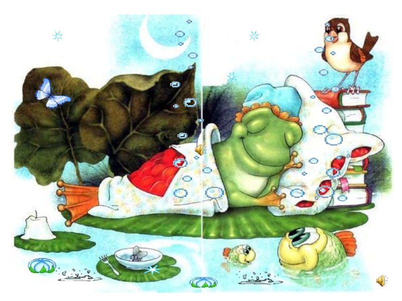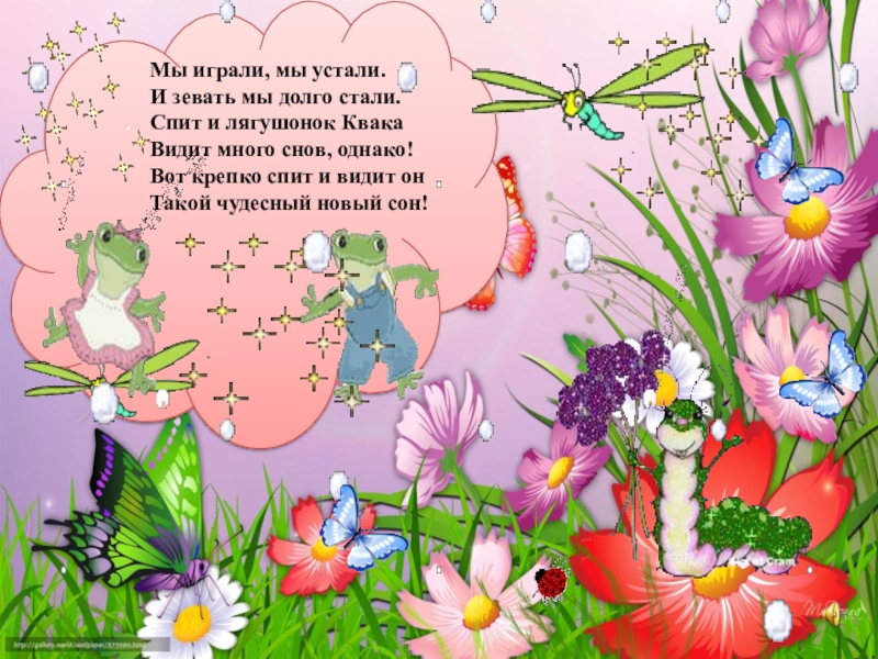 Мы играли, мы устали. И зевать мы долго стали.  Спит и лягушонок КвакаВидит много снов, однако!Вот крепко