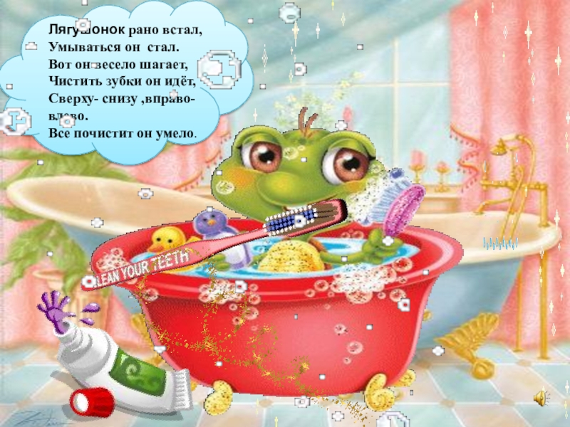 Лягушонок рано встал, Умываться он стал.Вот он весело шагает,Чистить зубки он идёт,Сверху- снизу ,вправо-влево.Все почистит он умело.