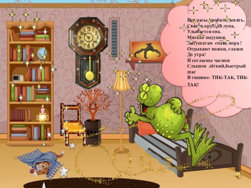 Вот часы пробили девять.Светит круглая луна,Улыбается она.Мягкие подушки.Лягушатам спать пора !Отдыхают ножки, глазкиДо утра!И согласны часикиСлышен лёгкий,быстрый