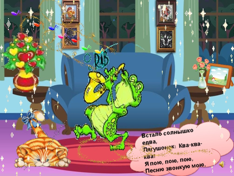 Встало солнышко едва,Лягушонок: Ква-ква-ква! Я пою, пою, пою, Песню звонкую мою.