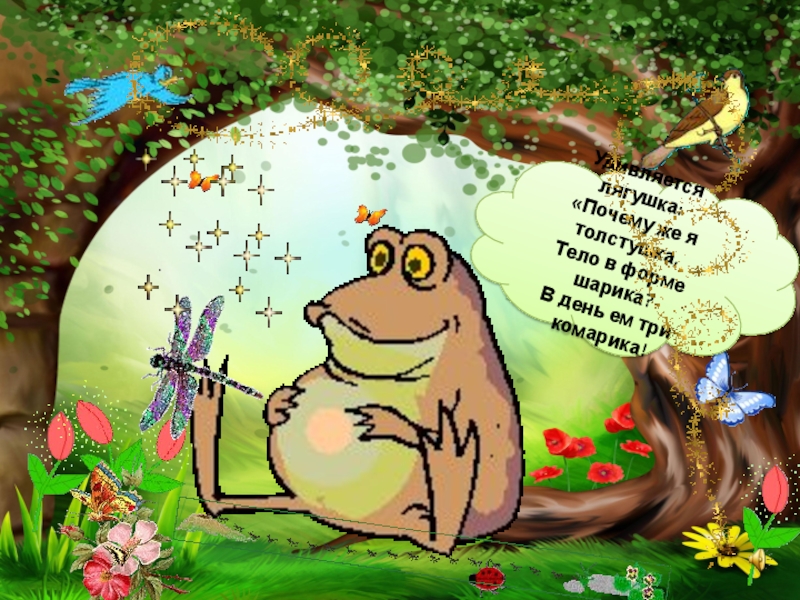 Слайд 30Удивляется лягушка: «Почему же я толстушка, Тело в форме шарика? В день ем три