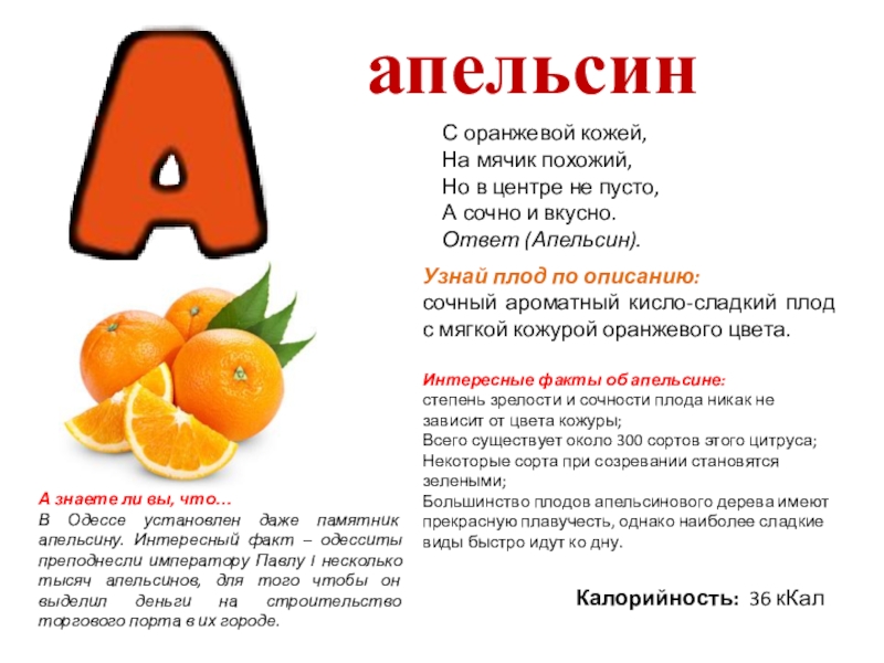 В Одессе установлен даже памятник апельсину. Интересный факт – одесситы преподнесли императору Павлу I несколько тысяч апельсинов, для того чтобы он выделил деньги на строительство торгового порта в их городе.