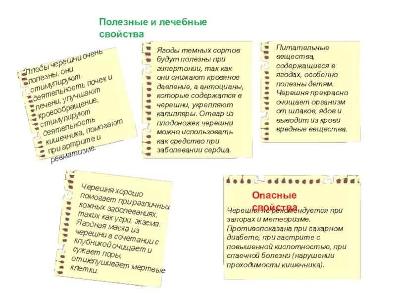 Питательные вещества, содержащиеся в ягодах, особенно полезны детям. Черешня прекрасно очищает организм от шлаков, ядов и выводит из крови вредные вещества.